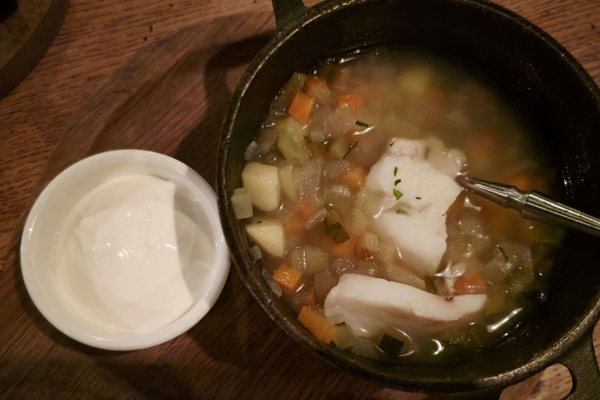 – Это калья, рыбный суп, с добавлением огуречного рассола, – рассказал шеф-повар ресторана «1586» Степан Шестопалов, продемонстрировав свое кулинарное творение журналистам «Культурного региона». – В старину этот суп также готовили из капустного рассола, были и мясные кальи. Я когда узнал про этот суп, посмотрел, из чего он состоит, понял, что о нем мало кто из моих коллег и знакомых слышал. Решил это приготовить. Русскую кухню надо возрождать и знакомить с ней как можно больше людей. Это действительно вкусно!