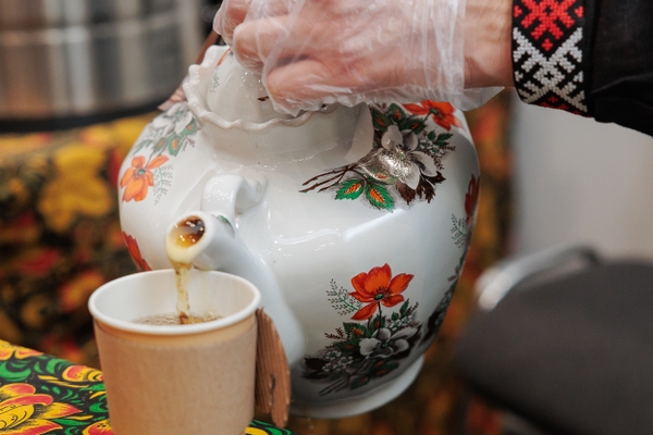 Стенд фермера и предпринимателя Алексея Синецкого как-то сразу обращает на себя внимание. Еды у него, кроме связки калачей, почти нет, зато есть много чая. Огромный 40-литровый трактирный самовар на дровах и с куклой-грелкой наверху, чайники, готовый, свежезаваренный напиток из таволги, мяты, душицы и чабреца в разных вариантах.