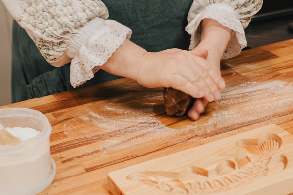 Процесс формовки со стороны выглядит просто, но это лишь так кажется. А для того, чтобы пряник точно получился, требуется учесть множество нюансов. Сначала доска посыпается мукой, а затем раскатывается первый пласт теста. Он должен быть немного потолще, чем второй, потому что на нем Валентина будет проминать, формовать пряничек, как раз чтобы все вырезанные элементы рисунка на дощечке на нем и пропечатались.