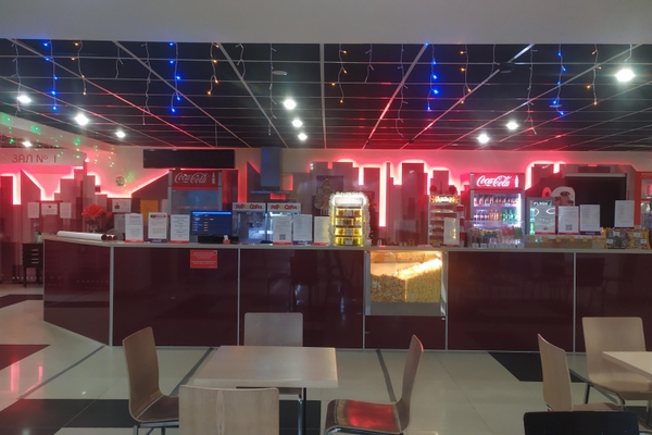 На территории кинотеатра работает кинобар, в котором можно приобрести прохладительные напитки и попкорн.