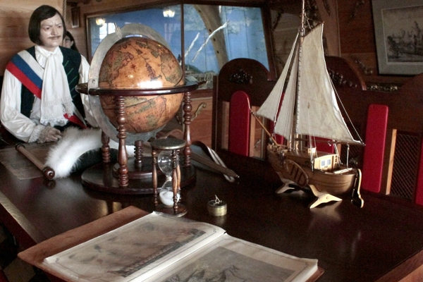 Рядом с кроватью располагается рабочее место капитана: секретер, совмещающий в себе письменный стол и книжный шкаф. За длинным столом, где и проходили переговоры команды, на судне-музее восседает царь Петр – манекен, отражающий внешний облик будущего императора. На столе гравюра Адриана Шхонебека, акварели Питера Бергмана и чертежи разных кораблей.