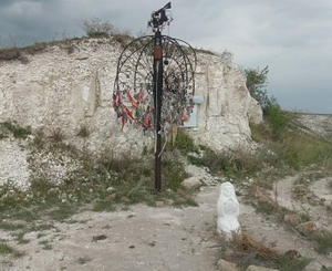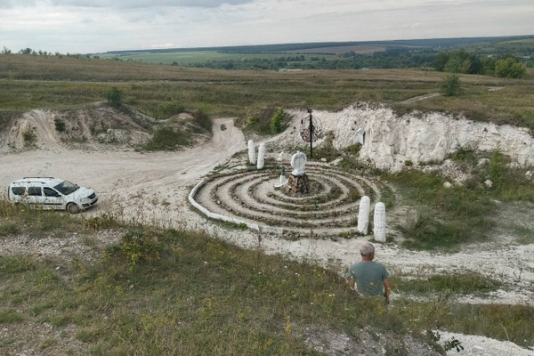 За одной из окраинных улиц Архангельского, на взгорке, несколько десятилетий назад местные жители добывали мел – так образовался небольшой карьер. И быть бы ему заброшенным и замусоренным, но часто бывавший в этих местах художник из Нововоронежа Евгений Федоров сумел разглядеть в изрезанном рельефе большой культурный потенциал. Сначала он вырезал на склоне лик Божией Матери – не по строгим иконографическим канонам, а так, как представилось – с младенцем на руках и голубем у лица. Затем Евгений Петрович выложил лабиринт из камней «Спираль любви и надежды», как в глубокой древности наши предки.